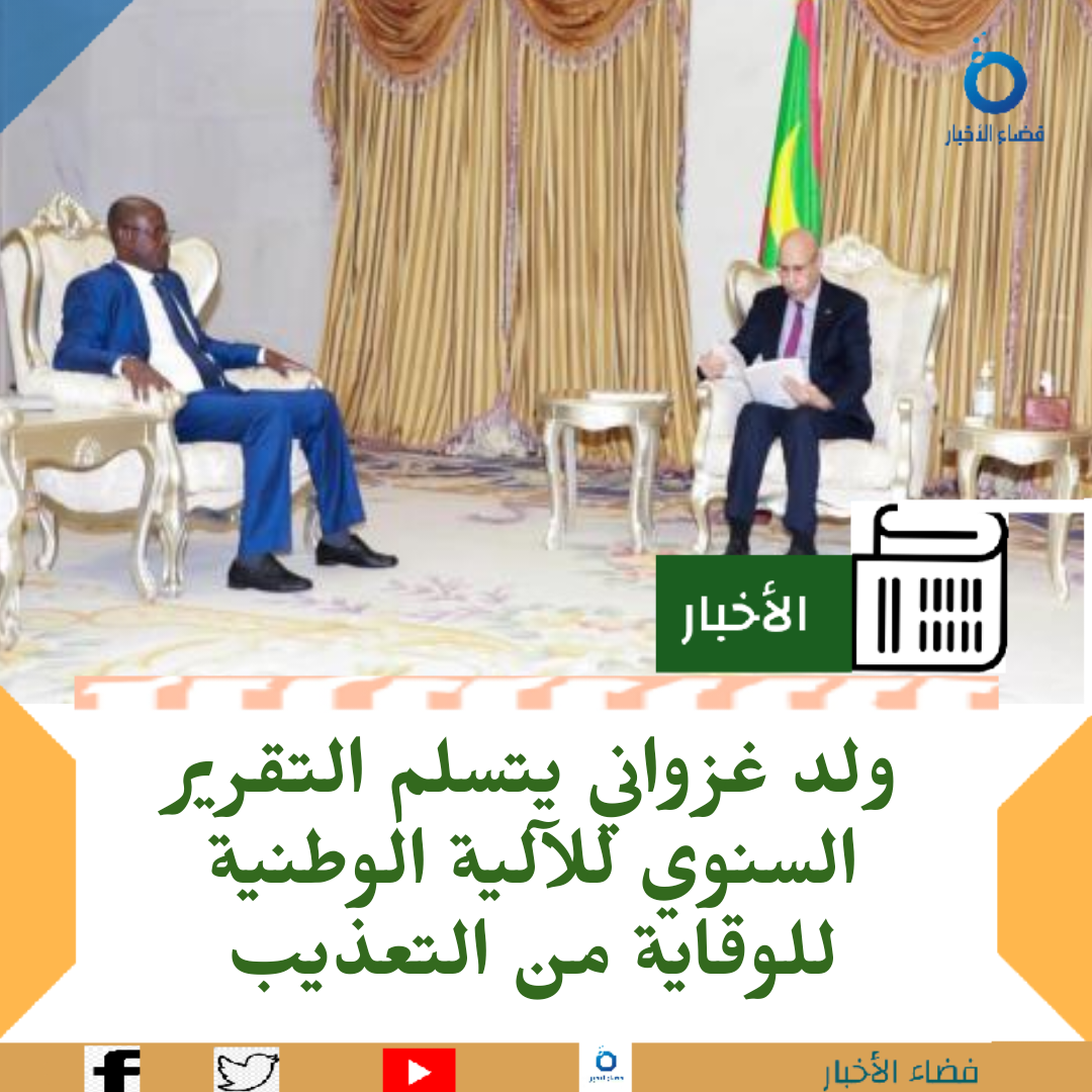 فضاء الاخبار : تسلم الرئيس محمد ولد الشيخ الغزواني، التقرير السنوي للآلية الوطنية للوقاية من التعذيب اليوم الثلثاء من رئيس الآلية البكاي ولد عبد المالك.
