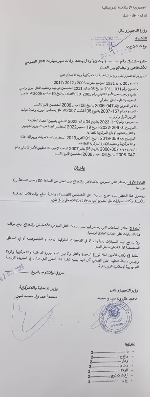 وجاء في مقرر الوزارة ,,: يحظر النقل من الساعة 00 ليلا إلى غاية الساعة 05 فجرا.