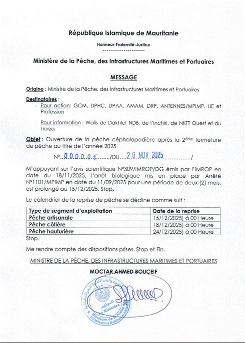 وحددت الوزارة 24 ديسمبر القادم موعدا لاستئناف نشاط الصيد الصناعي بنواذيبو.