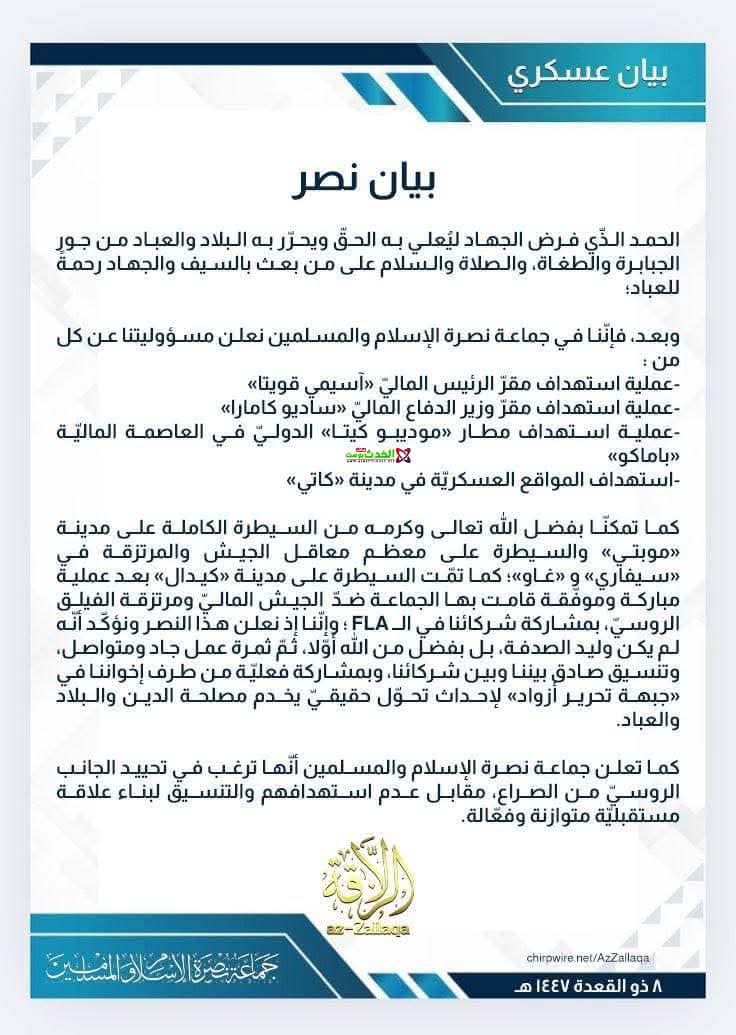 وأفادت الجماعة بأنها تمكنت من السيطرة على مدينة موبتي ومعظم معاقل الجيش والمرتزقة في سيفاري وغاو، فضلاً عن السيطرة على مدينة كيدال، في عمليات قالت إنها جاءت بتنسيق مع شركائها في “جبهة تحرير أزواد”.
